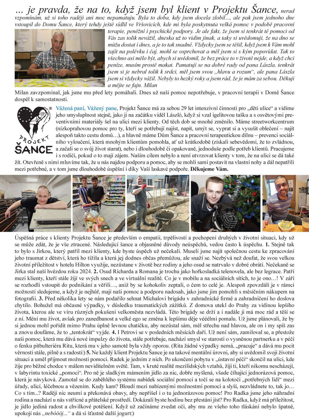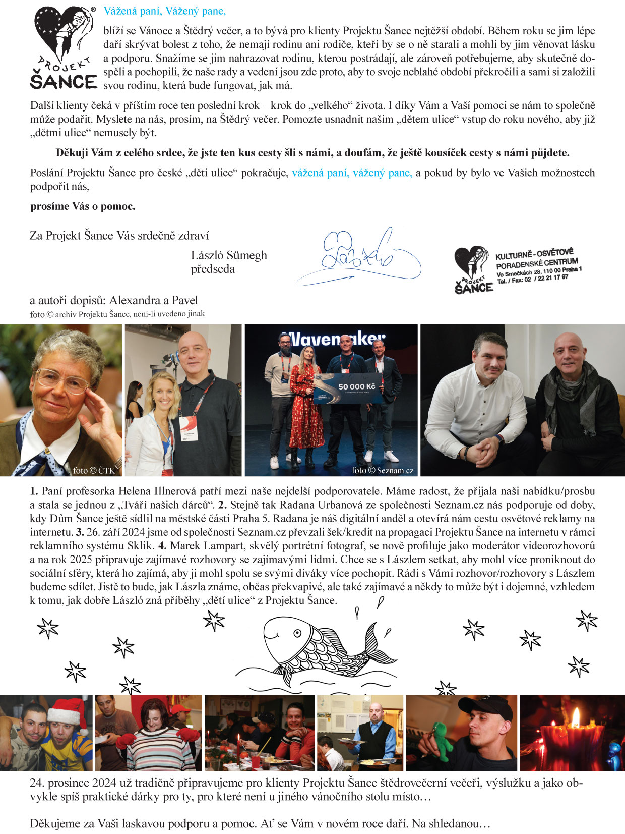 A to je pro letošní rok poslední informační dopis z Projektu Šance. Dá-li Bůh, tak v roce 2025 otevřeme naše centra po krátkém odpočinku 13.–14. ledna a znovu naše pomáhání v Projektu Šance rozjedeme nanovo… a snad budeme úspěšní alespoň tak jako v roce 2024.