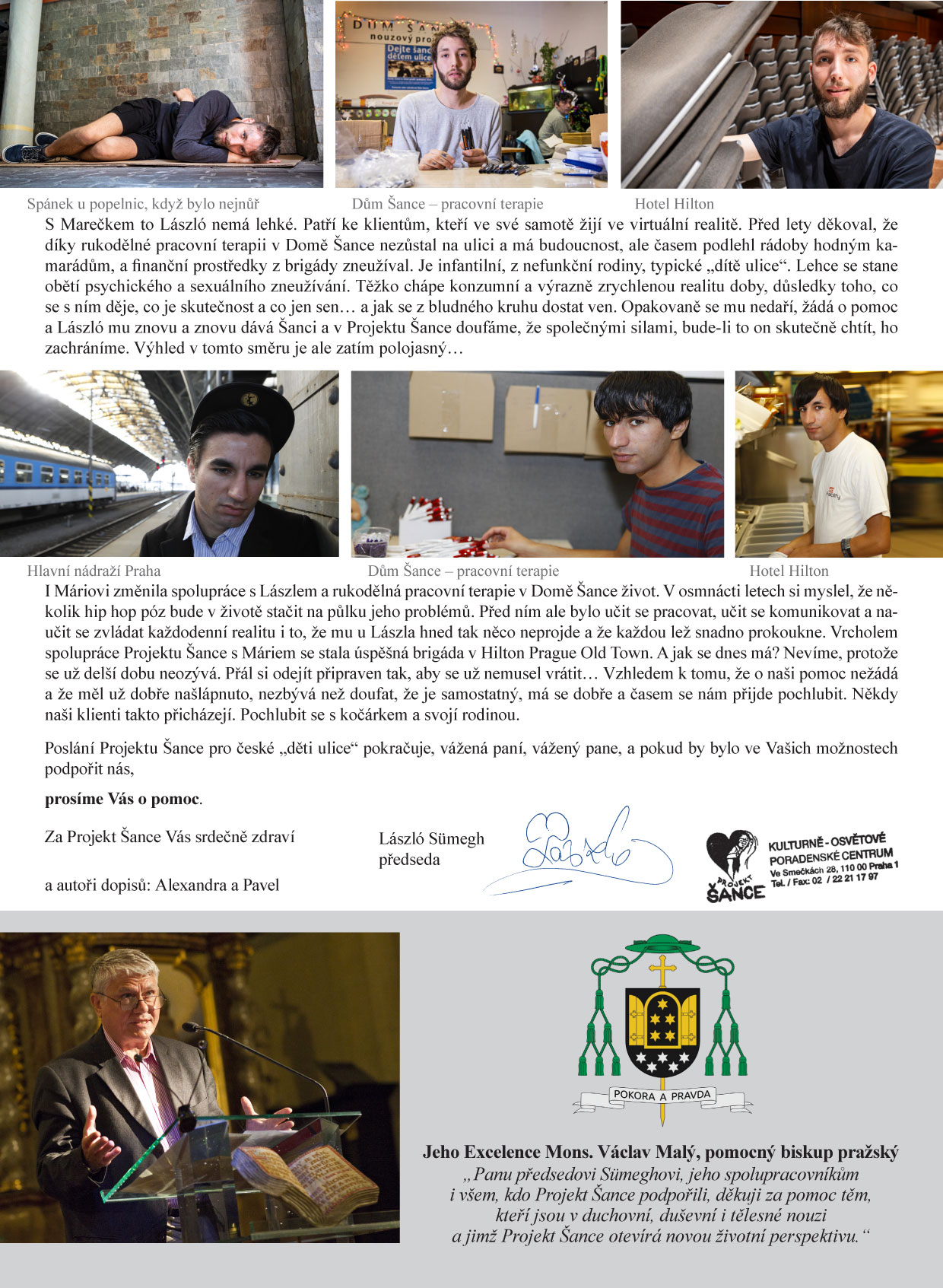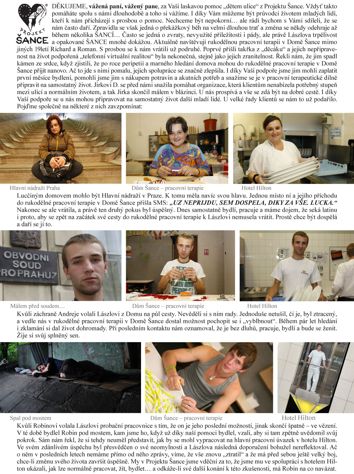 Radost nám dělá, že ti, kteří přijali nabídku spolupráce v Domě Šance v rukodělné pracovní terapeutické dílně, se ze svých problémů zpravidla dostali a žijí nezávisle samostatným životem. Mají rodiny a nepatří mezi potřebné. Za 30 let existence Projektu Šance jsme byli součástí tohoto zázraku již mnohokrát, za což DĚKUJEME.